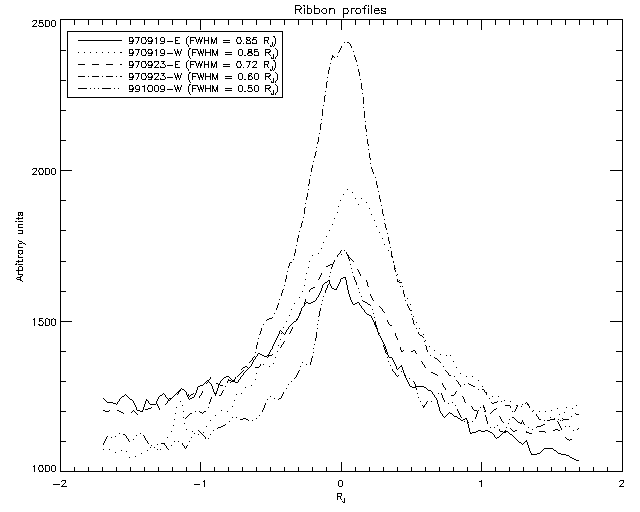 Figure 4: Parallel temperature estimates. The parallel (field-aligned) temperature can be estimated from the vertical extent of the torus, most easily measured in the warm bright "ribbon" feature. Here we measure the field-aligned FWHM of the ansae in figure 3, and using the single-species model of Hill and Michel [1976], calculate parallel temperatures (listed in table III). Because the torus is far from single-species, these temperates are probably about 25% too high.